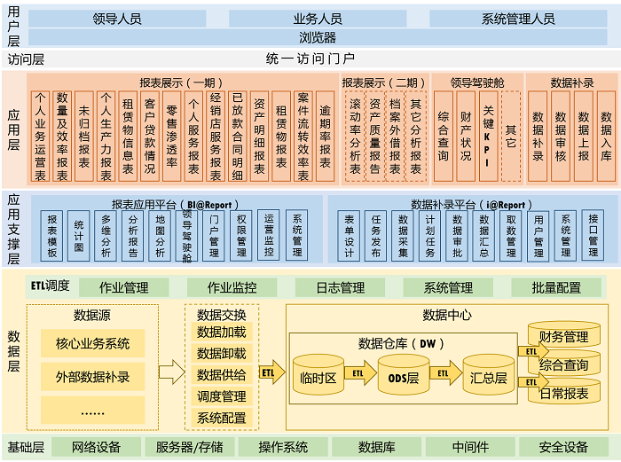基于對業(yè)務(wù)數(shù)據(jù)的匯總、加工等數(shù)據(jù)模型設(shè)計,在成熟的數(shù)據(jù)采集產(chǎn)品和數(shù)據(jù)補錄軟件平臺的基礎(chǔ)上構(gòu)建了數(shù)據(jù)展現(xiàn)分析模塊、數(shù)據(jù)補錄報送模塊 、用戶權(quán)限管理模塊以及門戶配置模塊 。